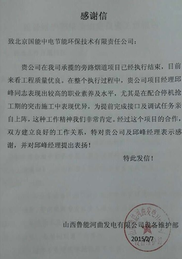 通過河曲EPC項目團隊的共同努力,我司承攬的山西魯能河曲發(fā)電有限公司旁路煙道EPC項目,工程建設質(zhì)量優(yōu)良,并在項目執(zhí)行過程中,現(xiàn)場團隊表現(xiàn)出較高的職業(yè)素養(yǎng)及水平,受到業(yè)主的一致贊譽,同時也與業(yè)主建立了良好的合作關系。