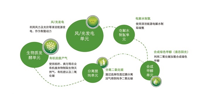 風(fēng)光生物質(zhì)聯(lián)合制儲氫(液態(tài)陽光)一體化碳中和技術(shù)是國能中電以國家“雙碳”目標(biāo)為指引,在自身優(yōu)勢的生物質(zhì)能技術(shù)基礎(chǔ)之上,打破產(chǎn)業(yè)壁壘,融通產(chǎn)業(yè)鏈條,成功孵化的以風(fēng)能、太陽能、生物質(zhì)能、氫能等清潔能源為代表的一體化碳中和項目,該項目主要包括風(fēng)力發(fā)電單元、電解水制氫單元、生物質(zhì)發(fā)酵產(chǎn)氣單元、合成甲醇單元,在消納秸稈等有機(jī)固廢的同時,利用清潔能源為氫能產(chǎn)業(yè)提供綠色甲醇,通過能源循環(huán)利用最終實現(xiàn)碳中和。該項目建立了全新的清潔能源產(chǎn)業(yè)鏈協(xié)同利用模式,是國能中電碳中和路徑的有益實踐,也是我國能源結(jié)構(gòu)重整的創(chuàng)新之舉。